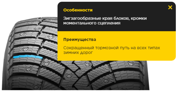 Одним из ключевых нововведений данной модели является измененная конструкция шипа. За счет применения новых материалов и уменьшения размеров вес металлического элемента удалось снизить на 15%. Твердосплавная вставка, контактирующая с дорожной поверхностью, изготовлена из карбида вольфрама с повышенной устойчивостью к износу. Вокруг шипов имеется специальная «лунка», измельчающая ледяные частицы на более мелкие фракции. Резиновая смесь в нижнем «базовом» слое стала более жесткой. Это повышает прочность фиксации шипов в протекторе. Все эти мере улучшили сцепные свойства на обледенелом покрытии. Протекторный рисунок был изменен. V-образный дизайн с расширяющимися по мере приближения к плечевым зонам канавками обеспечивает отменную устойчивость на мокрых и покрытых талым снегом дорогах.